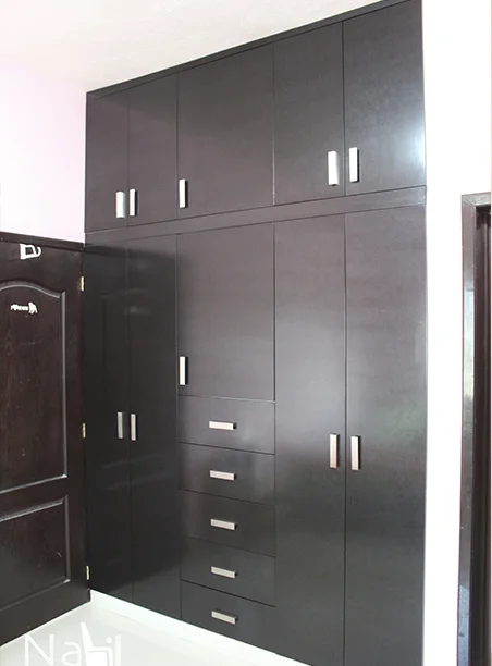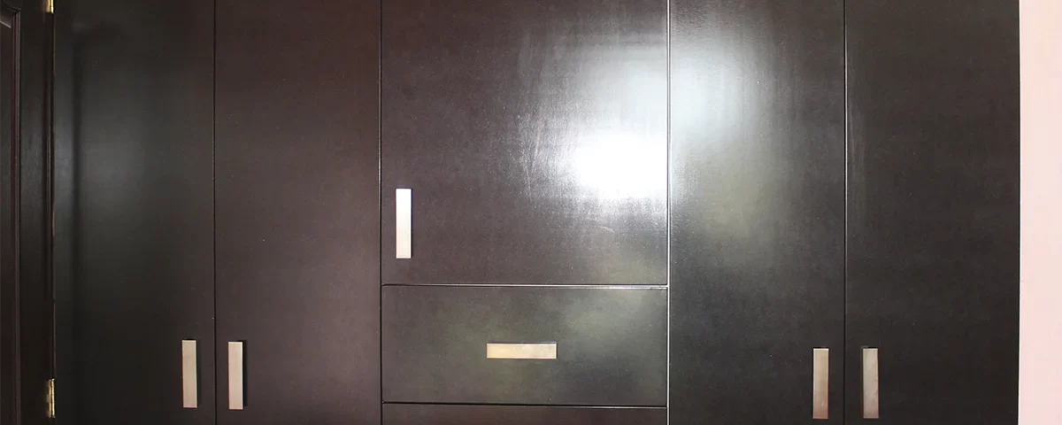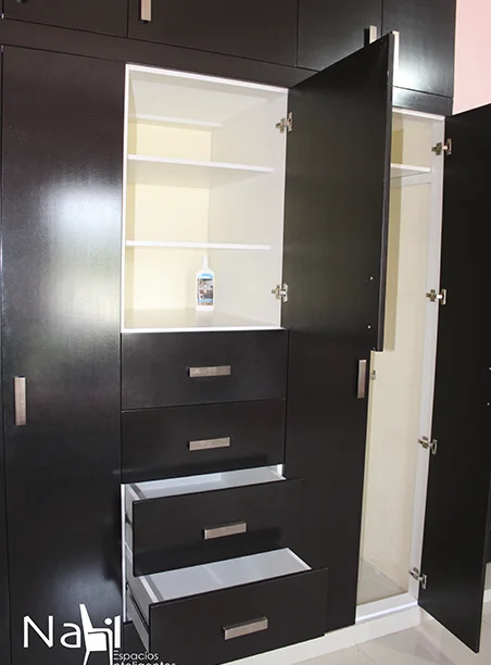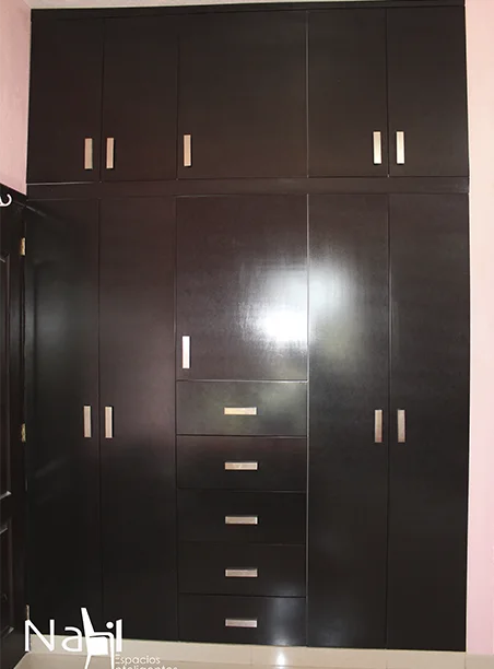 Este proyecto tiene como principal atributo el acabado alto brillo color chocolate que contrasta con los interiores blancos. Se integran dos áreas de colgadores, 4 gavetas y un área de maleteros para organizar mejor el espacio.