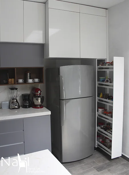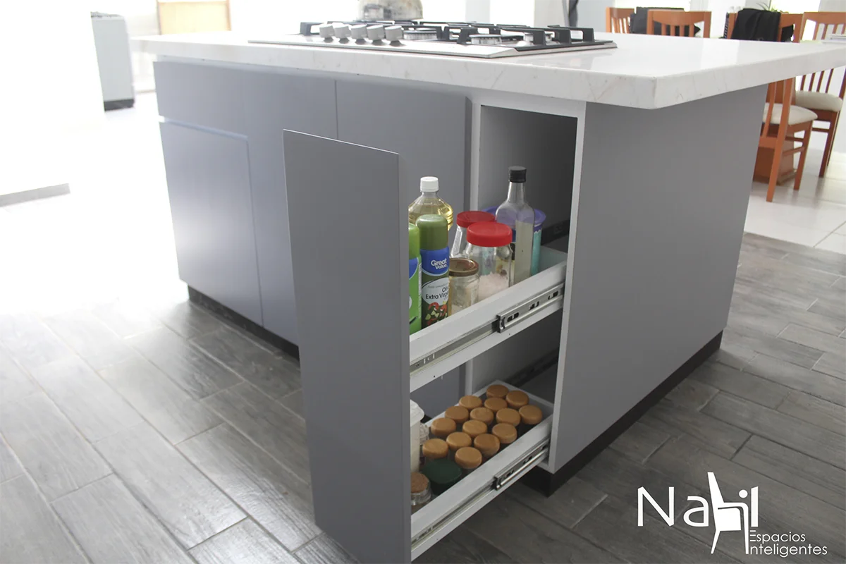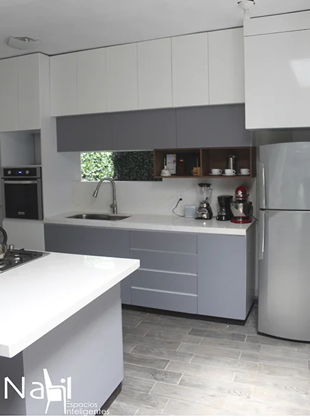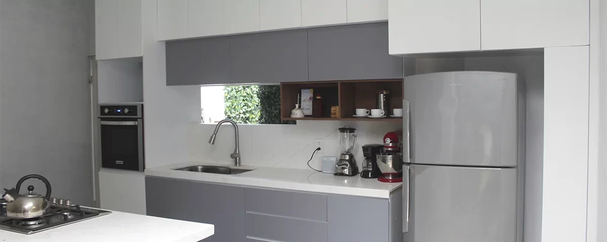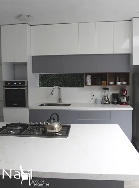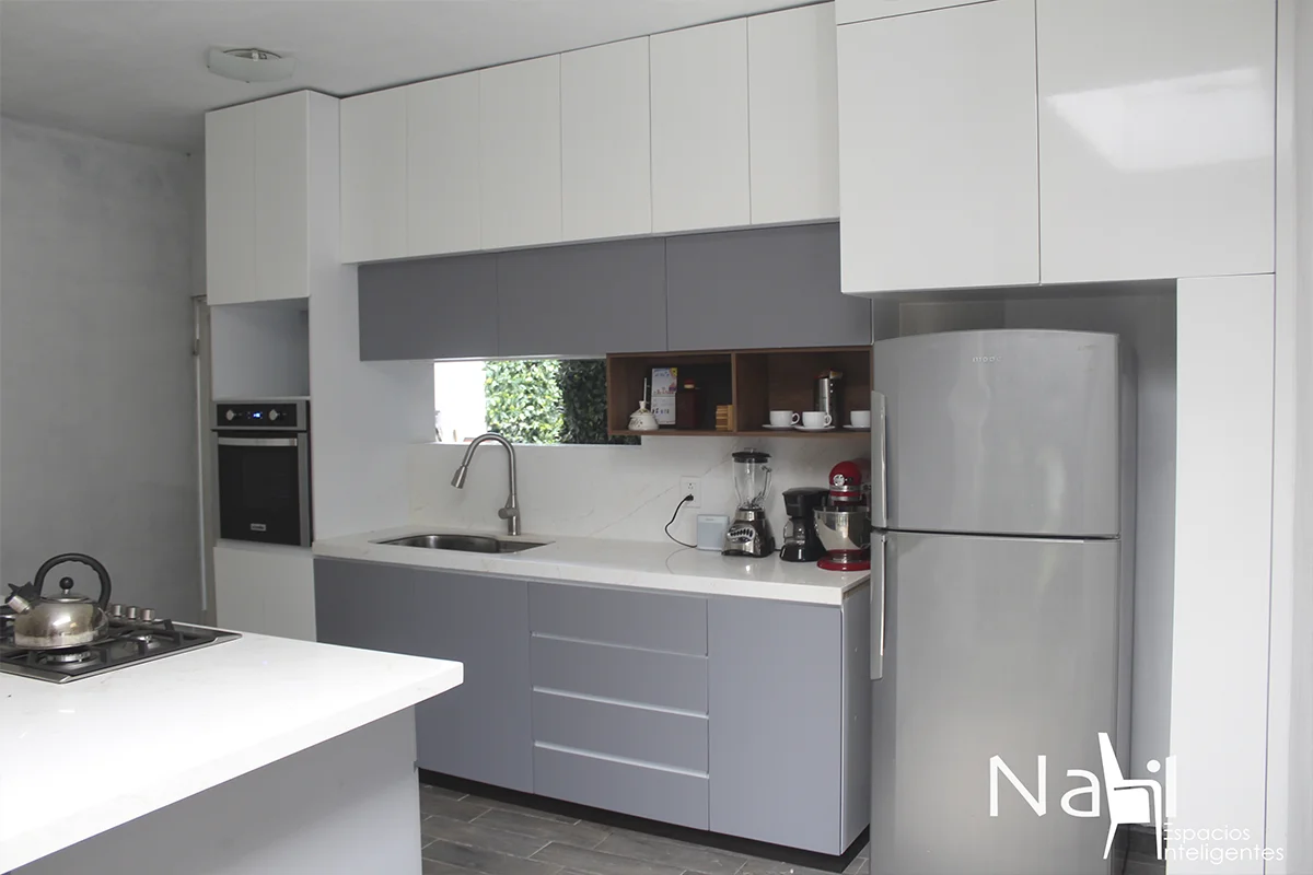 Una cocina en sentido lineal más una isla para cocción de alimento que combina tonos claros y una barra de granito blanco que hacen lucir este espacio. Además, la apertura de puertas con corte 45° le dan un toque elegante y discreto.