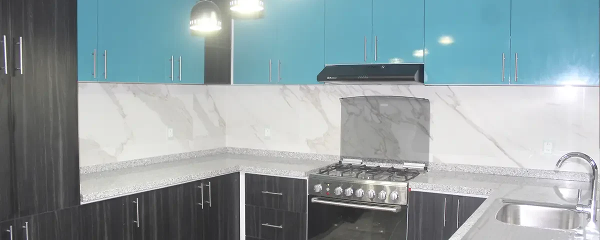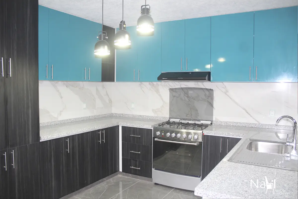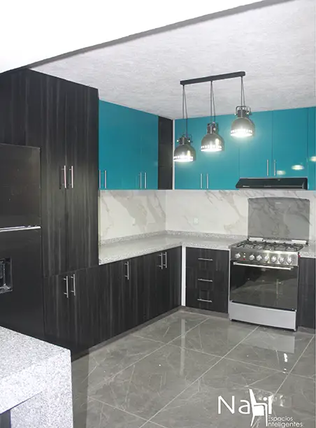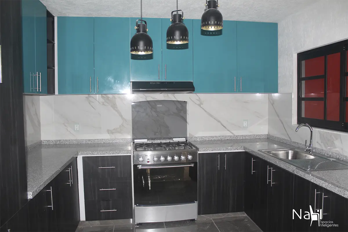 puertas Turquesa en alto brillo. La barra de granito claro le da el toque final de elegancia.