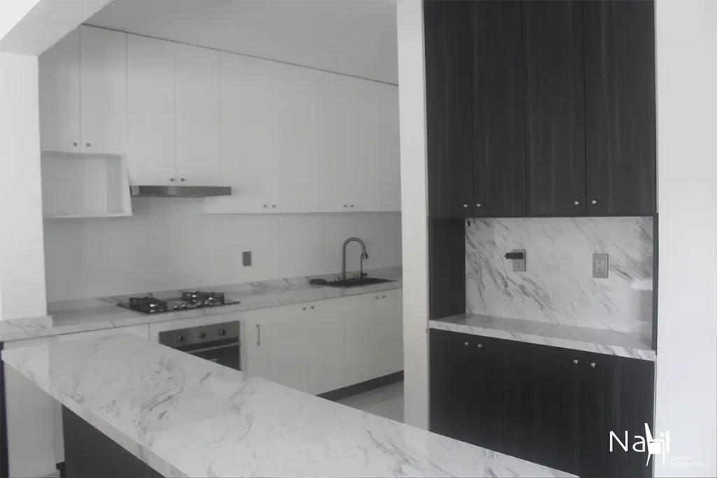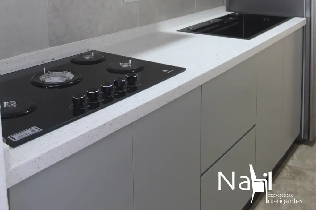 - Frentes de puerta. Acabado Encino Noche y alto brillo Turquesa. Barra de granito Acapulco