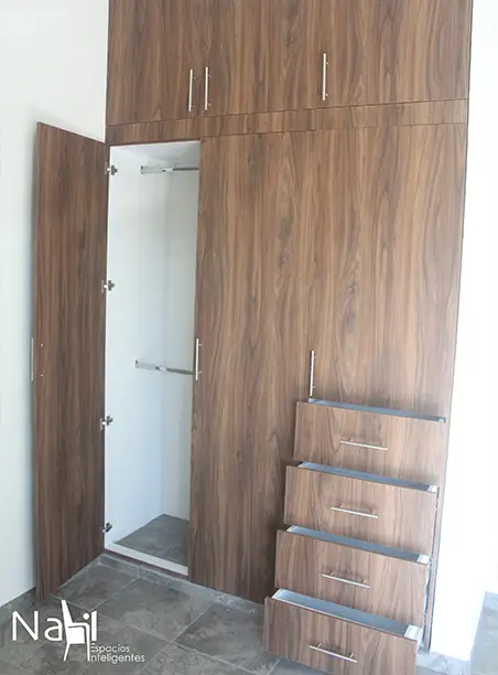 Este diseño de closet básico con una torre de gavetas, zona de colgador y área de maletero.